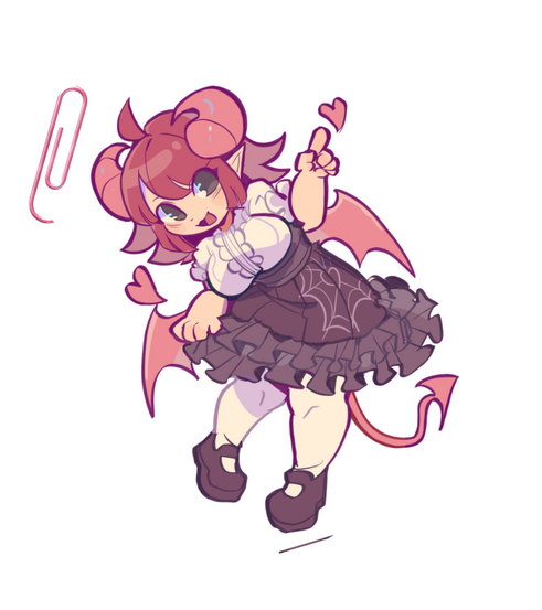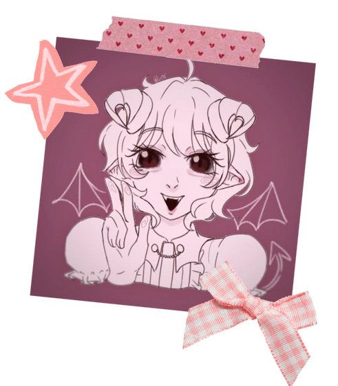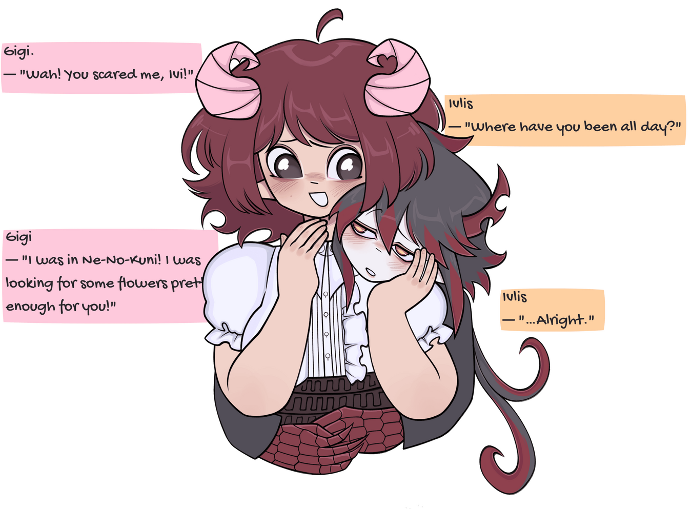 Gigi is one of Ivlis underlings! She is a flame demon and take care of Poemi and Licorice. She cares deeply for Ivlis and genuinely wants to see him happy.Gigi often brings flowers to Ivlis in an attempt to cheer him up. At first, she also bakes sweet treats for him—until she notices his reactions to each bite. Eventually, she decides to replace the snacks with small, useless gifts instead… but they’re cute!She has a daughter named Ginebra. Ivlis created her from flames to stop Gigi’s constant complaints about wanting a baby of her own. She’s far too similar to both of them to be a coincidence
